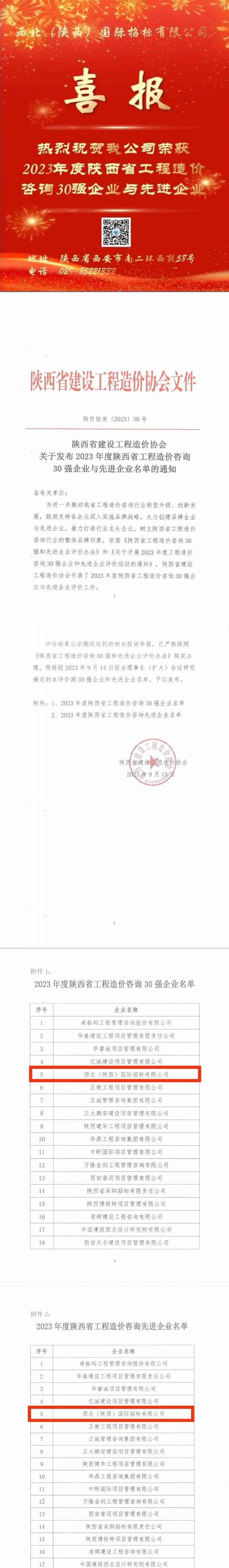 熱烈祝賀我公司榮獲2023年度陜西省工程造價咨詢30強(qiáng)企業(yè)與先進(jìn)企業(yè)