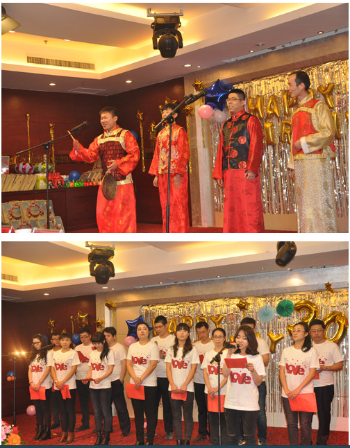 主持人侯潤澤 、常樂宣布演出開始,辦公室張琦以一曲慷慨激昂的男聲獨唱《中國人》首先登場。緊接著設(shè)備部的小合唱《我相信》和《明天會更好》點燃了全場觀眾的情緒,大家被團結(jié)和積極向上的氛圍感染。造價部胡建輝、謝新、李珂、張翔宇的三句半《說造價》用詼諧而生動的陜西方言道出了造價工作的艱辛與樂趣;楊大衛(wèi)的小號表演優(yōu)美動聽;詩朗誦《牽動造價舞動人生》則以高昂的情懷抒發(fā)了造價人對造價工作的熱愛。財務(wù)室常樂帶來的古典舞蹈《驚鴻舞》將觀眾帶入到一個優(yōu)美而婉約的意境中;劉卿和李偉合作的小提琴吉他伴唱《當(dāng)你老了》深情動人。工程部的小品《小璐超級訪問》和楊東峰的魔術(shù)《分不清左右》充分展現(xiàn)了年輕人的才華,包袱疊起,讓人捧腹不止。抽獎與游戲環(huán)節(jié)更是讓觀眾熱情高漲,八十位同志有幸在此環(huán)節(jié)中獲得一、二、三等獎。晚會最后以一曲《相親相愛》結(jié)束。