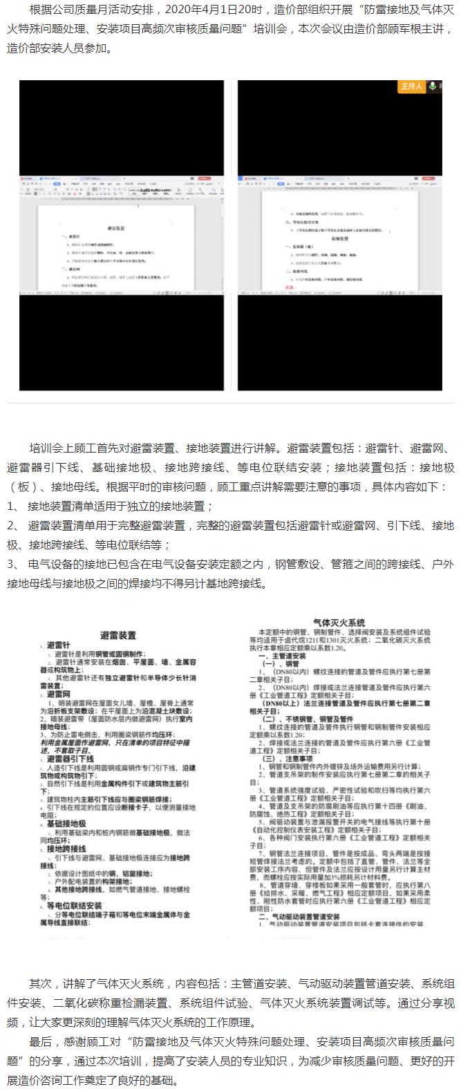 造價(jià)部組織開展“防雷接地及氣體滅火特殊問題處理、安裝項(xiàng)目高頻次審核質(zhì)量問題”培訓(xùn)會(huì)