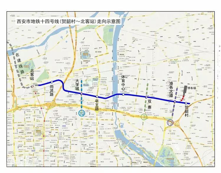 西安地鐵十四號(hào)線(最初規(guī)劃為十三號(hào)線)為東西走向,規(guī)劃東端起點(diǎn)為國際港務(wù)區(qū)窯村機(jī)場(chǎng)西側(cè),跨灞河后抵達(dá)北客站,與機(jī)場(chǎng)線貫通運(yùn)營。一期工程為賀韶村到~北客站(不含),主要為配合2021年西安第十四屆全運(yùn)會(huì)建設(shè)。線路長度約13.8km,依次沿向東路-學(xué)府中路(建材北路)-開發(fā)大道鋪設(shè),共設(shè)賀韶村站~港務(wù)大道站~三義莊站(新增)~雙寨站~體育中心站~辛王路站~學(xué)府路(大學(xué)城)站~尚賢路站車站8座(不含北客站),其中換乘站3座,均為地下站,設(shè)一處停車場(chǎng)(賀韶村停車場(chǎng)),設(shè)主變電所1座(太華北路與學(xué)府中路東北象限)。