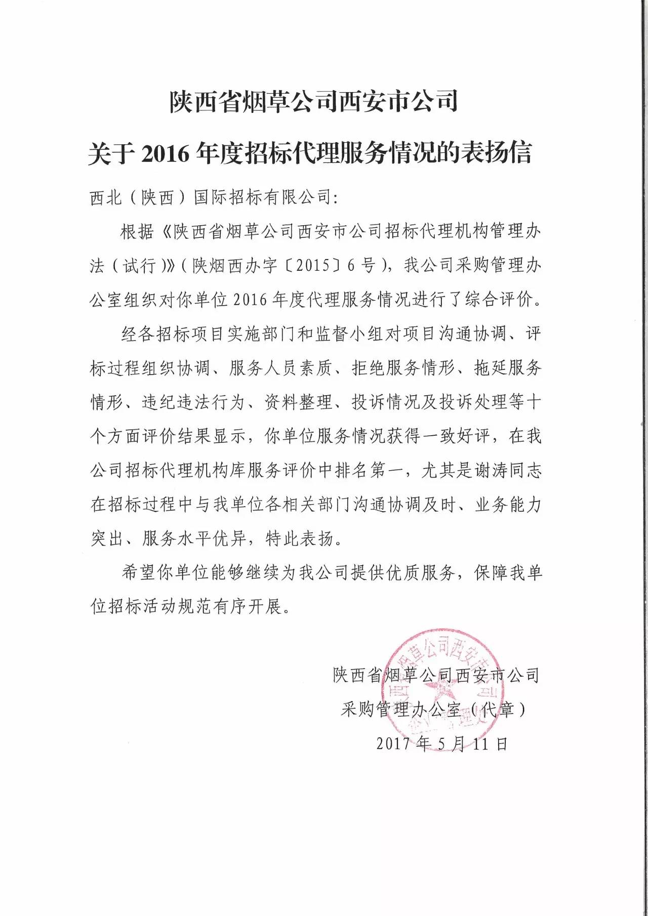 近日,我公司收到陜西省煙草公司西安市公司發(fā)來的表揚信。經(jīng)過綜合評價,我公司被評為西安市煙草公司2016年度招標代理服務評價第一名。對我公司代理服務給予積極評價,對謝濤同志的工作給予熱情肯定!