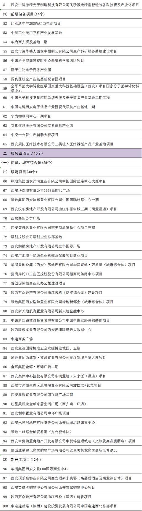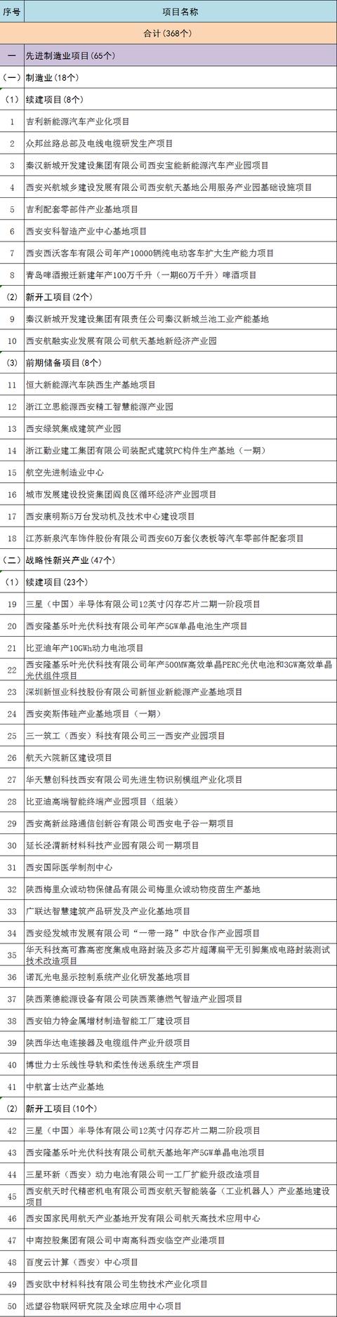 近日,西安市2020年市級重點項目名單發(fā)布。2020年西安市共安排368個重點項目,其中先進(jìn)制造業(yè)項目65個,包含制造業(yè)項目18個、戰(zhàn)略性新興產(chǎn)業(yè)項目47個;服務(wù)業(yè)項目110個,包含商貿(mào)城市綜合體項目65個、物流會展科技服務(wù)項目45個;文化旅游產(chǎn)業(yè)項目23個,包含文化產(chǎn)業(yè)項目15個、旅游產(chǎn)業(yè)項目8個;城建及基礎(chǔ)設(shè)施項目50個,包含電力供氣項目7個、機(jī)場鐵路地鐵道路項目43個;生態(tài)環(huán)保項目29個,包含垃圾處理項目3個、治水項目21個、治綠項目5個;社會事業(yè)和民生保障項目91個,包含教育項目22個、體育衛(wèi)生項目34個、老舊小區(qū)改造和背街小巷改造項目8個、安置房建設(shè)項目23個、其他項目4個,具體名單如下。